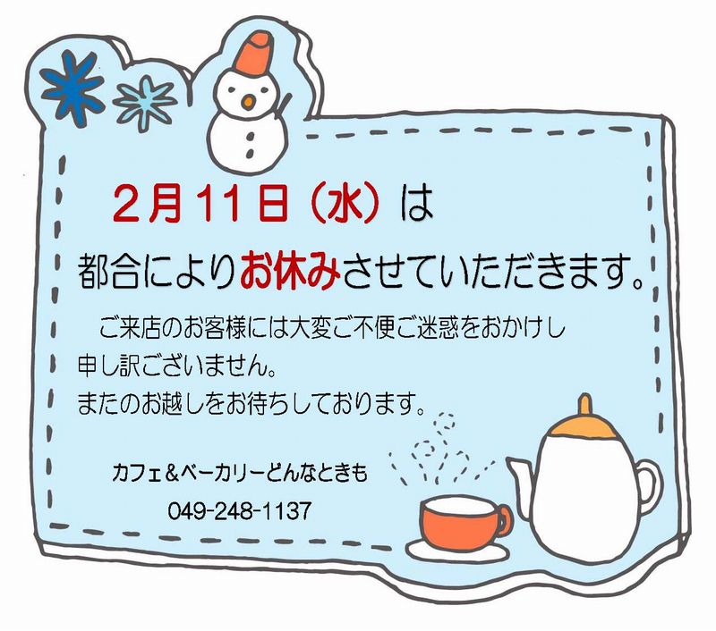 2月11日(水)は都合によりお休みさせていただきます。 ご来店のお客様には大変ご不便・ご迷惑をおかけし申し訳ございません。 またのお越しをお待ちしております。