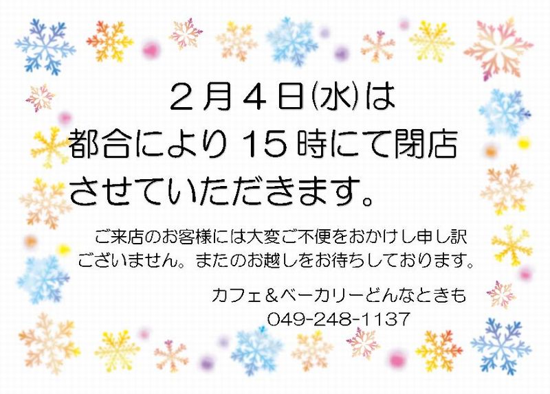 2月4日(水)は都合により15時にて閉店させていただきます。 ご来店のお客さまには大変ご不便をおかけし申し訳ございません。 またのお越しをお待ちしております。